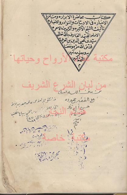 الجزء الاول من الكتاب وعلى غلافه الداخلي تملك دون تاريخ ل حمودة حسن ابي زند . وتملك اخر للشيخ محمد جمعه النجار 13 ذي الحجه 1340 (1921 م ) من بياع كتب في يافا .