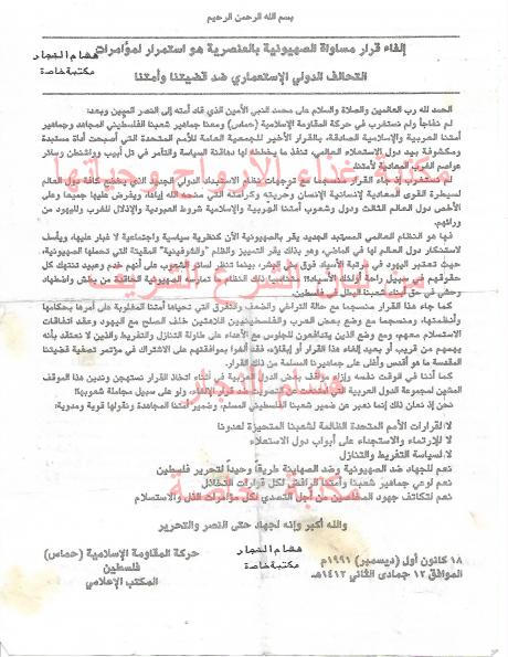 بيان صدر عن حركة حماس في تاريخ 18 كانون الاول عام 1991 ووزع في مدينة القدس
