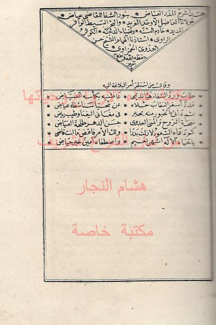 مجلد طبع فيه مناهل الشفا لجلال الدين السيوطي وكتاب الشفاء للقاضي عباض في المتن مع شرحه للمحقق حسن العدوي الحمزاوي - عليه تملك للشيخ محمد جمعه النجار ووقفية للكتاب