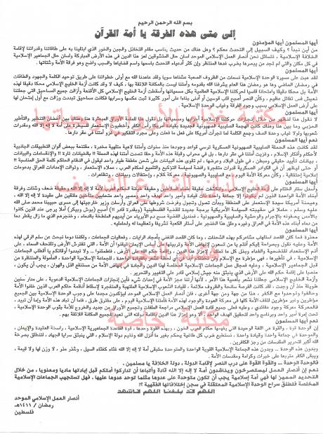 وثائق وبيانات أنصار العمل الاسلامي الموحد رفم - 1