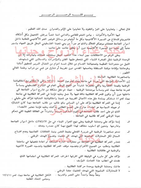 وثائق وبيانات الكتل الطلابية في جامعة بيت لحم رقم - 1