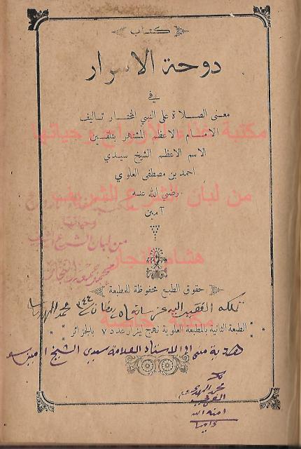على صفحة الغلاف الداخلية تملك ل محمد المهدي المغربي بتاريخ 25 رمضان 1344 ومنه هدية الى العلامة الشيخ امين سويد رحمهم الله تعالى .