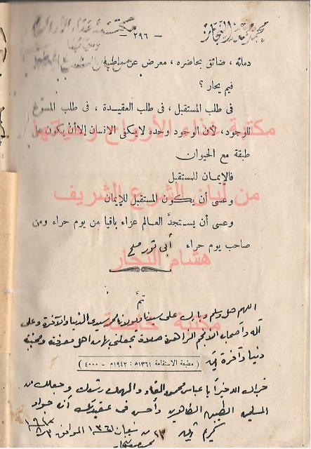 تم شراءها من مكتبة الطاهر في يافا - تاريخ قراءة مع دعاء للمؤلف من الشيخ محمد جمعه النجار بتاريخ 23 شعبان 1361 الموافق 3-8 -1942