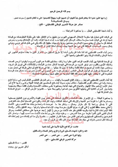 وثائق وبيانات حركة التحرير الوطني الفلسطيني فتح - رقم - 4