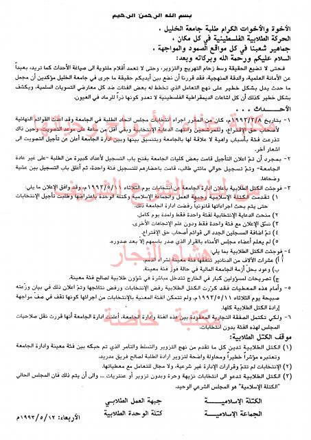 وثائق وبيانات الكتلة الأسلامية جامعة الخليل