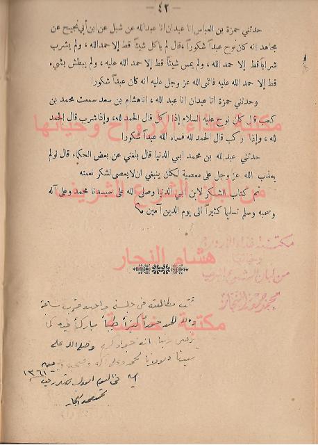 عليه قراءة للشيخ محمد جمعه النجار في الاول من رجب 1361 الموافق 1942 - يوجد في المجلد كتاب اخر وهو كتاب اكرام الضيف ل ابي اسحاق ابراهيم بن اسحاق الحربي