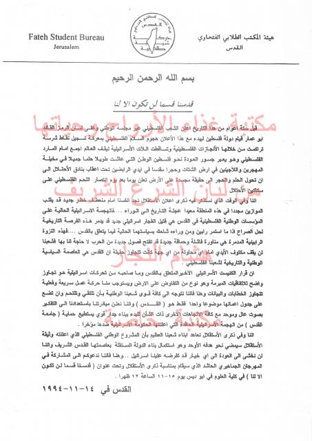 وثائق وبيانات حركة الشبيبة الطلابية - القدس رقم - 1
