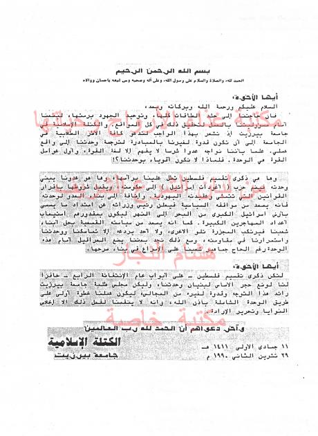 وثائق وبيانات الكتلة الأسلامية جامعة بير زيت - رقم - 30