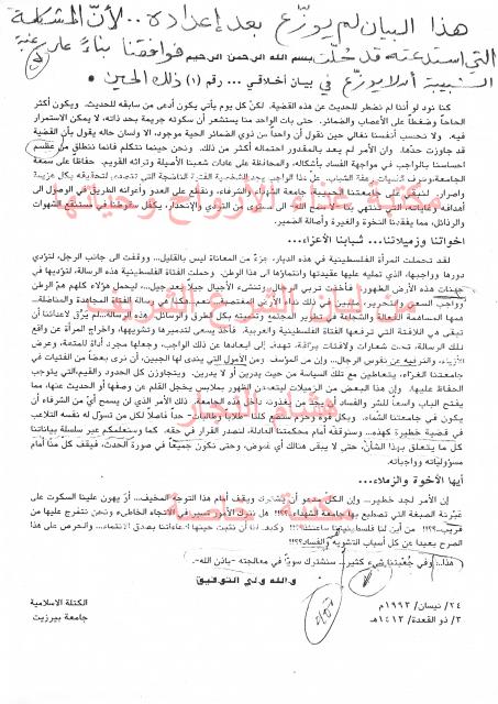 وثائق وبيانات الكتلة الأسلامية جامعة بير زيت - رقم - 46