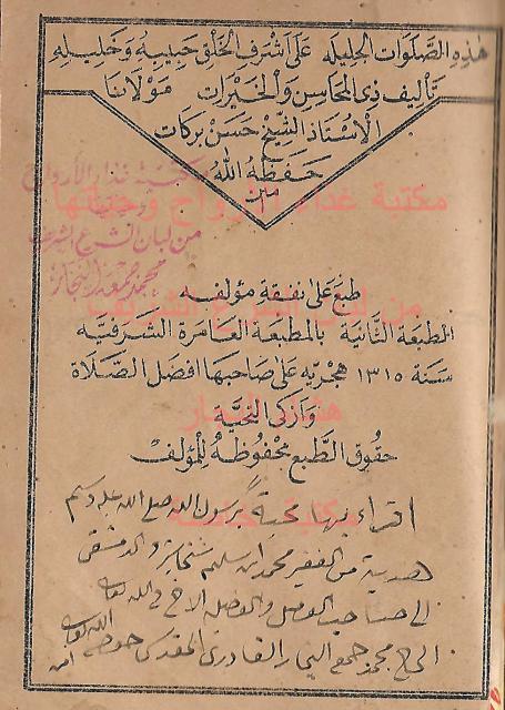 على الغلاف الداخلي اهداء من محمد ابن سليم شخاشيرو الدمشقي الى الشيخ محمد جمعة النجار القادري المقدسي