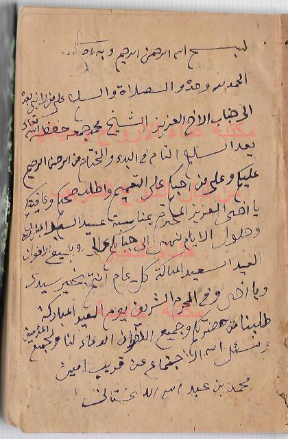 عليه اهداء من الشيخ طنطاوي جوهري الى الشيخ محمد جمعه النجار مع رسالة عن طريق الشيخ محمد بن عبدالله الدغستاني رحمهم الله --- عليه تملك للشيخ محمد جمعه النجار سنة 1921 - 1334