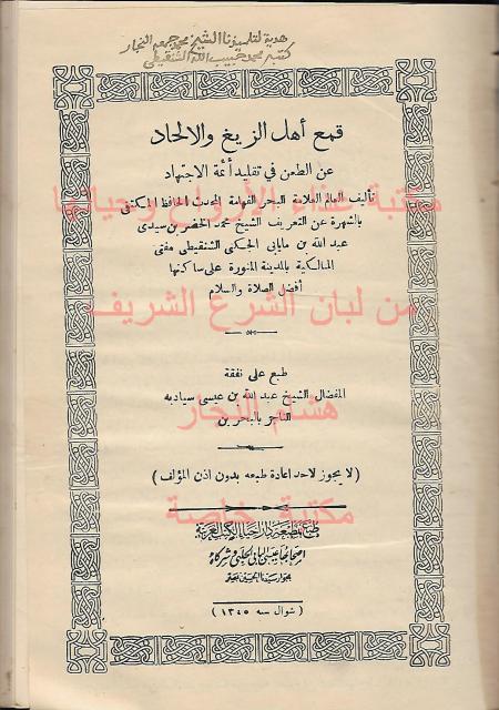 عليه اهداء من الشيخ محمد حبيب الله الشنقيطي الى تلميذه الشيخ محمد جمعه النجار