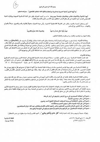 وثائق وبيانات الكتلة الأسلامية جامعة بير زيت - رقم - 43