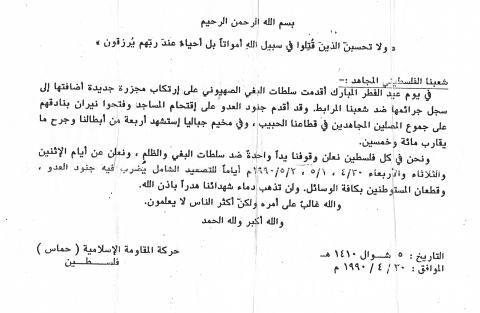 وثائق وبيانات حركة المقاومة الاسلامية حماس رقم - 143